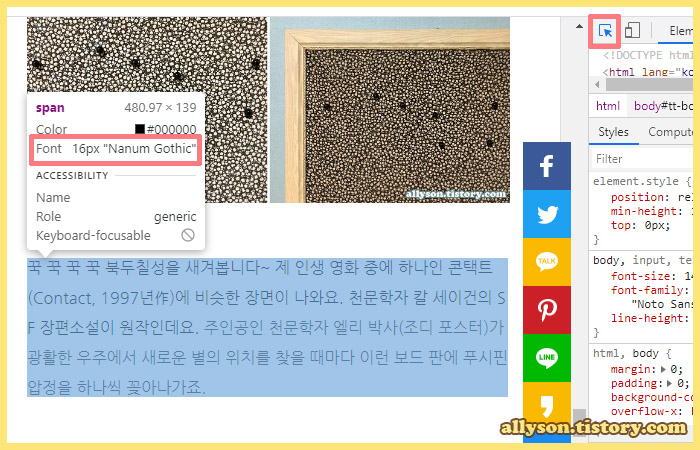 화살표가 파란색으로 바뀌는 걸 확인하고, 본문의 내용의 한 부분에 (클릭하지 않고) 커서만 올리면 현재 폰트크기를 확인할 수 있습니다. 원래 15px이었는데 16px로 수정한 상태입니다. 제가 사용했던 12포인트(pt)=16픽셀(px)입니다. 대부분의 브라우저에서 사용하는 폰트 기본값이 12pt=16px=1em=100%입니다.