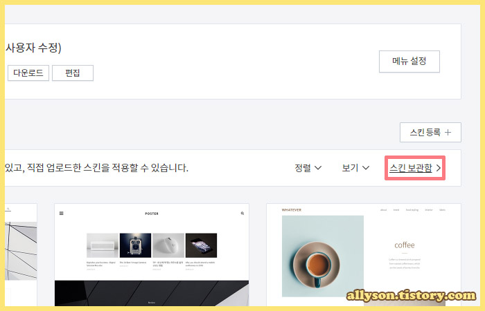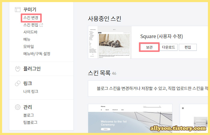 스킨 수정이 모두 끝나면 저장을 해두는 게 좋습니다. 수정을 여러 번 하다 보면 잘못돼서 이전 단계로 돌아가야 할 때가 꼭 한 번씩은 있으니까요. 블로그 관리 홈 > 꾸미기 > 스킨 변경 > 사용 중인 스킨 > 보관을 클릭합니다.
