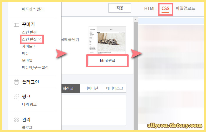 자, 그럼 티스토리 블로그 스킨으로 가서 CSS 수정을 해보겠습니다. 블로그 관리 홈 > 꾸미기 > 스킨 편집 > html 편집 > CSS 순서로 들어갑니다.