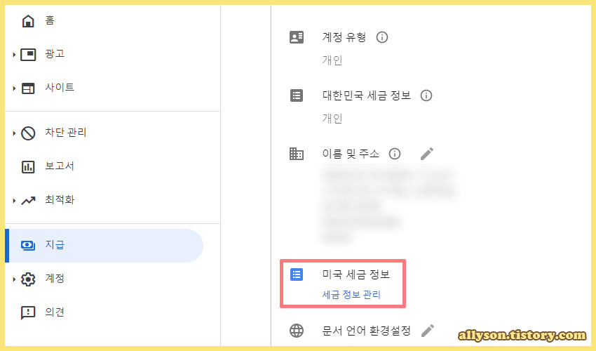 구글 애드센스 > 지급 > 설정 > 설정 관리.