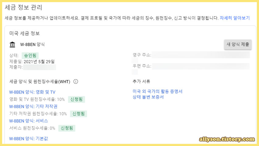 어제 5월 29일 자로 구글 애드센스 미국 세금 정보 제출을 했습니다.