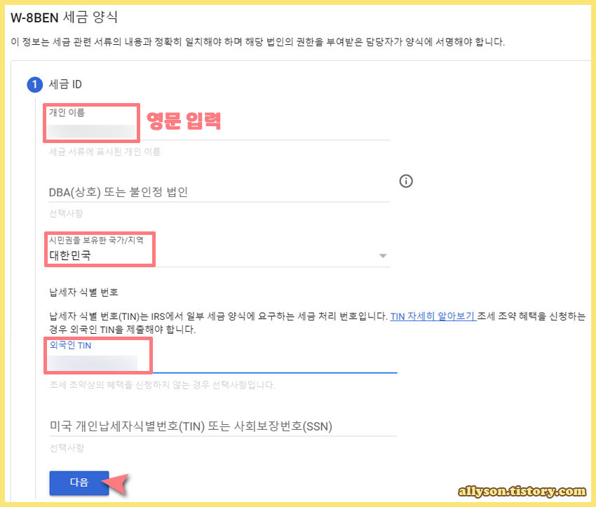 얼마 전까지만 해도 외국인 TIN (납세자 식별번호)에 개인 주민등록번호를 입력하지 말라고 했지만, 그 부분에 대해 변동 사항이 있는 듯하여 (100% 확실한 정보는 아님.) 저는 TIN 주민등록번호로 입력하여 제출했어요. 이 부분은 뒤에서 다시 얘기하겠습니다~.
