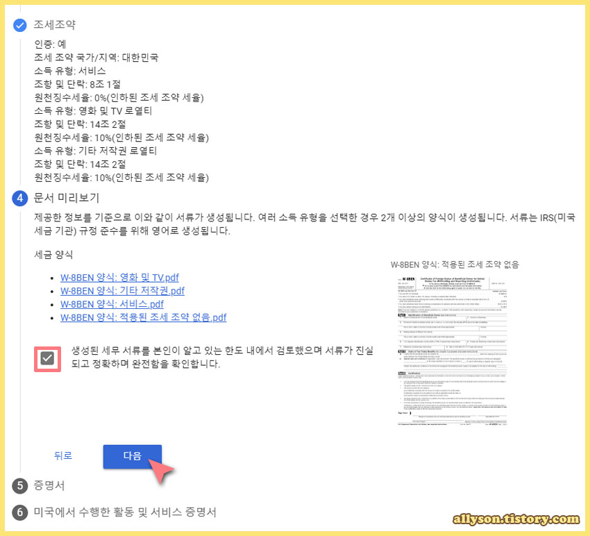 W8-BEN 양식이 4개 생성되었습니다. 신청한 3종류와 함께 적용된 조세 조약의 없음의 기본 양식이 추가되어 있습니다. "생성된 세무 서류를 본인이 알고 있는 한도 내에서 검토했으며 서류가 진실되고 정확하며 완전함을 확인합니다."에 체크 후 다음으로 넘어갑니다.
