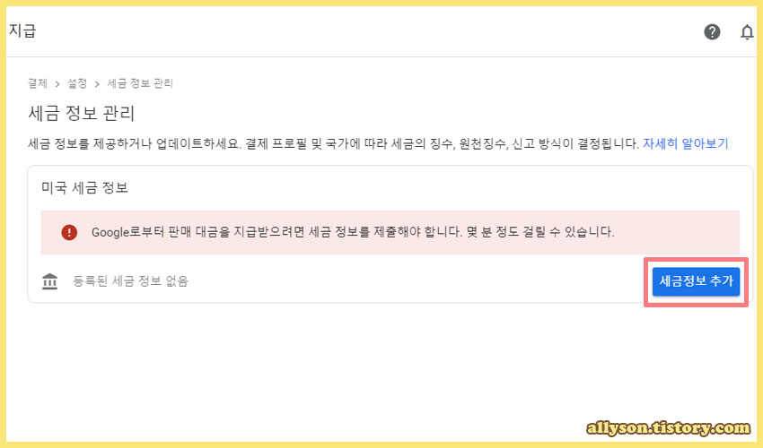 "Google로부터 판매 대금을 지급받으려면 세금 정보를 제출해야 합니다. 몇 분 정도 걸릴 수 있습니다."라고 나옵니다. 세금정보 추가를 클릭합니다.