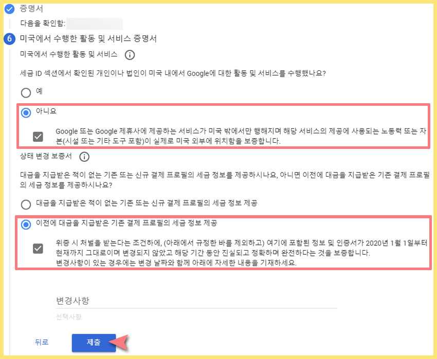 저는 시험 삼아 주민등록번호로 정보 제출을 완료했고, 혹시 나중에 허용되지 않는다면 양식 제출은 언제든 수정이 가능하니까요. 사업자는 사업자등록번호를 입력하면 됩니다.