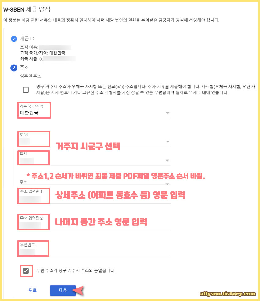 영문 주소로 검색하시면 주소를 영문으로 변환할 수 있어요. 국가와 시군구는 한글로 선택되고, 나머지 주소는 영문 입력하면 주소 순서가 좀 뒤섞입니다. 그래서 주소 1에 상세주소를 넣어줘야 최종 제출자료인 PDF 파일에 영문 주소 순서가 맞게 나옵니다.