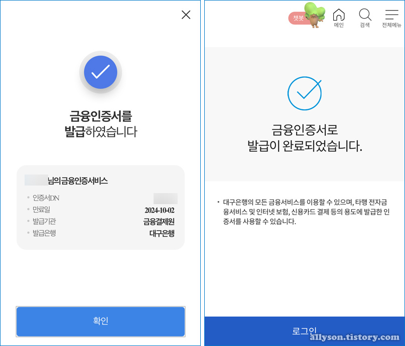 7개 거래은행 중 인증서를 사용하는 은행은 4군데이다. 그중 대구은행(IM뱅크 앱)에서 맨 먼저 금융인증서 발급을 해보았다. 우측 상단 전체 메뉴 (가로 세줄 햄버거 메뉴) > 인증센터 > 금융인증 > 인증서 발급/재발급으로 들어간다.