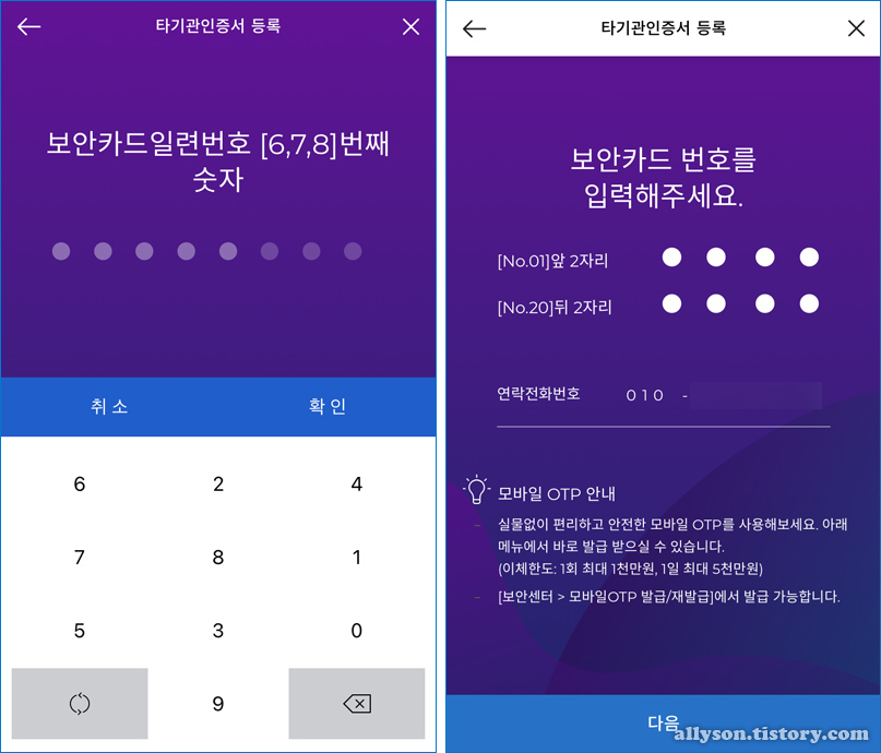 거래 은행이 많으면 많을수록 문자 인증, ARS 인증, OTP 또는 보안카드 번호 인증 등.. 금융인증서 발급방법 역시 완전 간단하게 느껴지진 않겠지만, 과정을 거치는 시간은 얼마 걸리지 않는다.