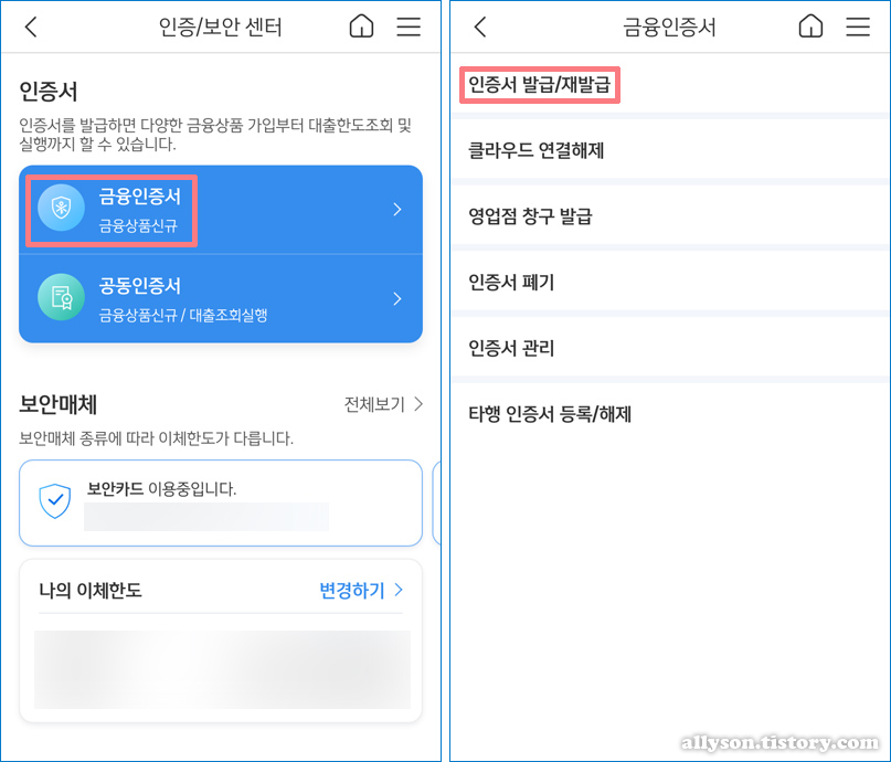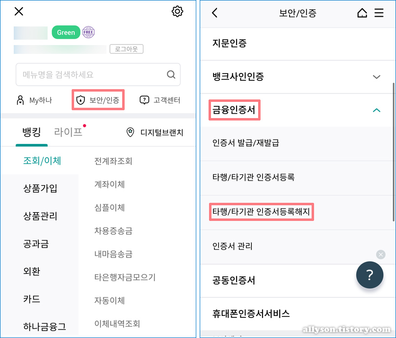 햄버거 메뉴 > 보안/인증 > 금융인증서 >